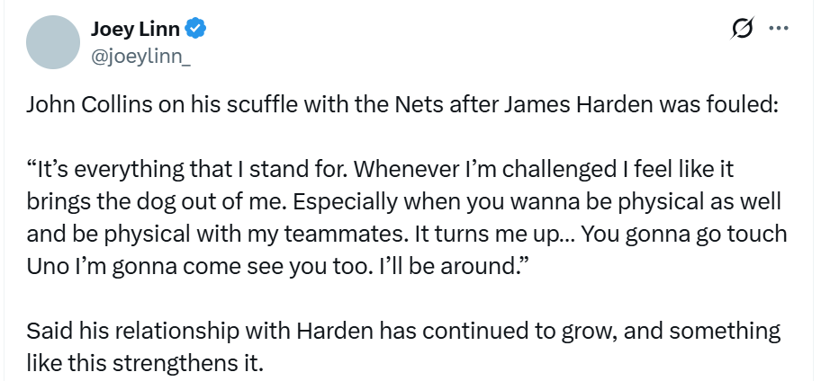 赛后科林斯直言:“这就是我的行事风格,如果有人想碰哈登,那我一定会揍他(You gonna go touch Uno I’m gonna come see you too),我随时都在。”