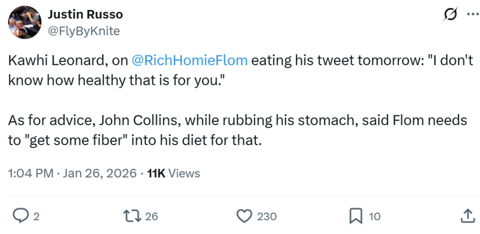 开局快船陷入困境时,一名网友曾公开表示如果本赛季快船任何阶段打出15胜3负表现,自己将打印这条推文并吃掉。